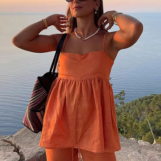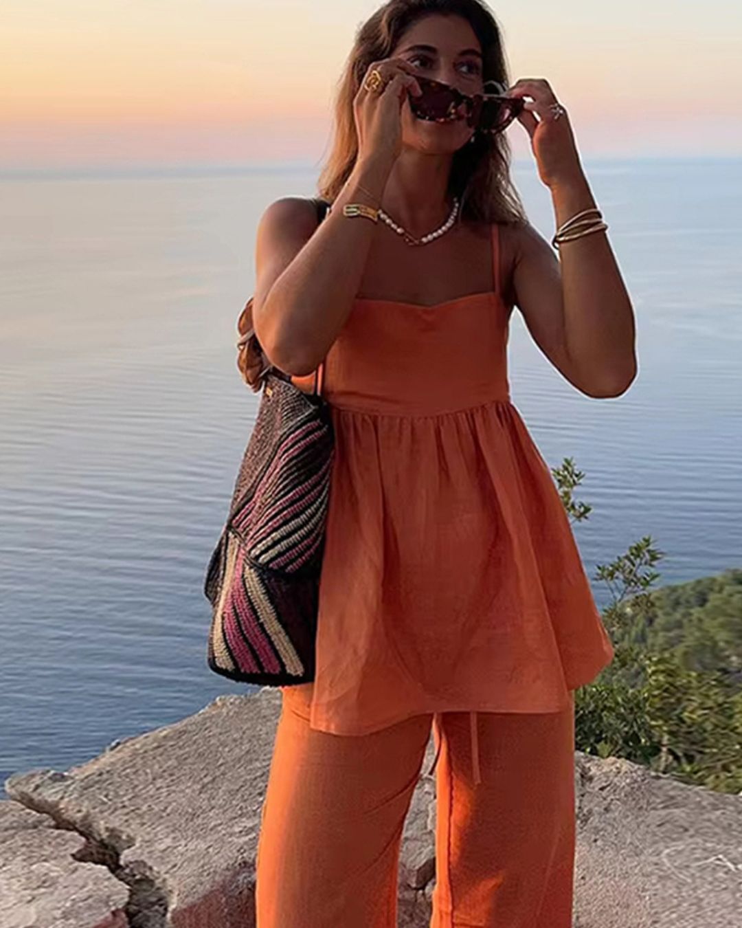 Este é o conjunto de calças regata com bainha com babados perfeito para mulheres elegantes! Com seu design sem mangas e costas nuas, ele é ideal para as férias. O conjunto inclui um colete e calças de perna larga, proporcionando conforto e estilo em duas peças. Aproveite!